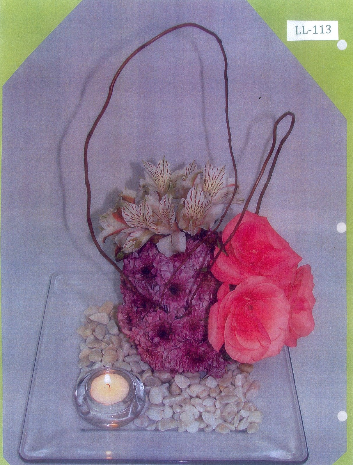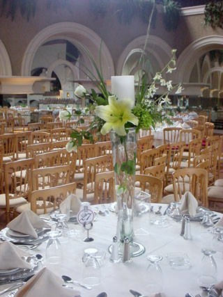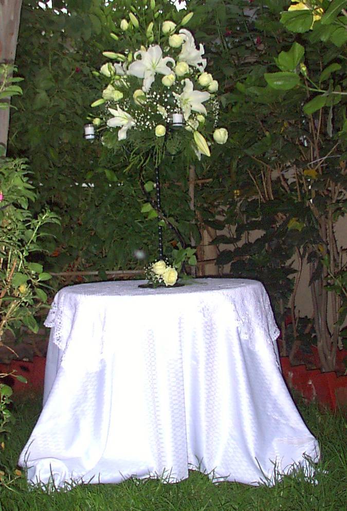 - 8 pedestales con flores naturales y mesa rectangular con mantel blanco. $2,750